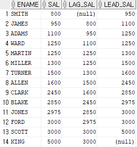 - lag 함수, lead 함수 : 위의 행을 아랫 행에 출력하거나, 아래의 행을 윗 행에 출력하는 함수